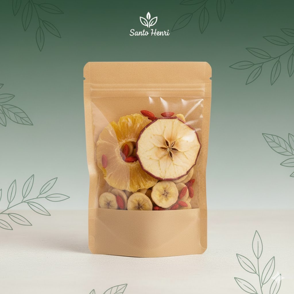 A banana desidratada, combinada com a canela, cria uma mistura equilibrada de doçura com um toque levemente picante. Os pedaços de maçã e abacaxi adicionam frescor, enquanto as goji berries são fontes conhecidas de antioxidantes e um leve toque azedinho irresistível. Não é apenas um snack, mas uma experiência gustativa saudável e prática.